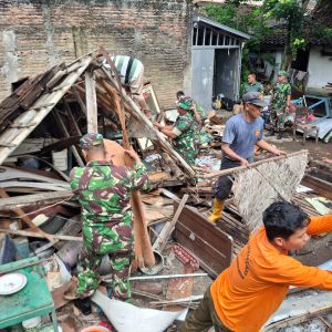 Koramil 03/Serengan Sigap Bantu Evakuasi Puing Rumah Roboh Akibat Angin Kencang di Danukusuman