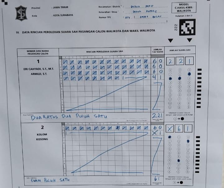 Penghitungan suara pemilihan wali kota dan wakil wali kota di TPS 014 Kecamatan Dukuh Pakis, Kelurahan Dukuh Kupang telah usai. Pasangan calon wali kota dan wakil wali kota Eri Cahyadi dan Armuji unggul mutlak di TPS 014 Dukuh Kupang, yang merupakan TPS Ketua Pimpinan Daerah Muhammadiyah (PDM) Surabaya Dr M Ridlwan MPd mencoblos.