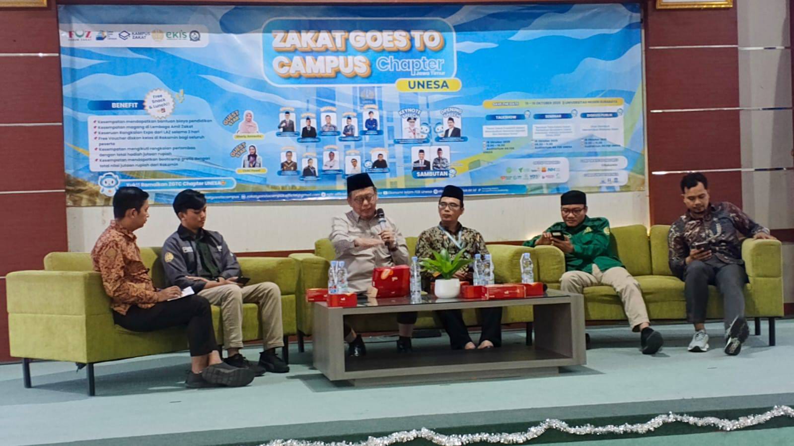 Surabaya, eNews - Forum Zakat (FOZ) Indonesia menggelar talk show Zakat Goes to Campus Chapter Jawa Timur di Auditorium Fakultas Ekonomika dan Bisnis (FEB) Universitas Negeri Surabaya (Unesa), Rabu (15/10/2025).