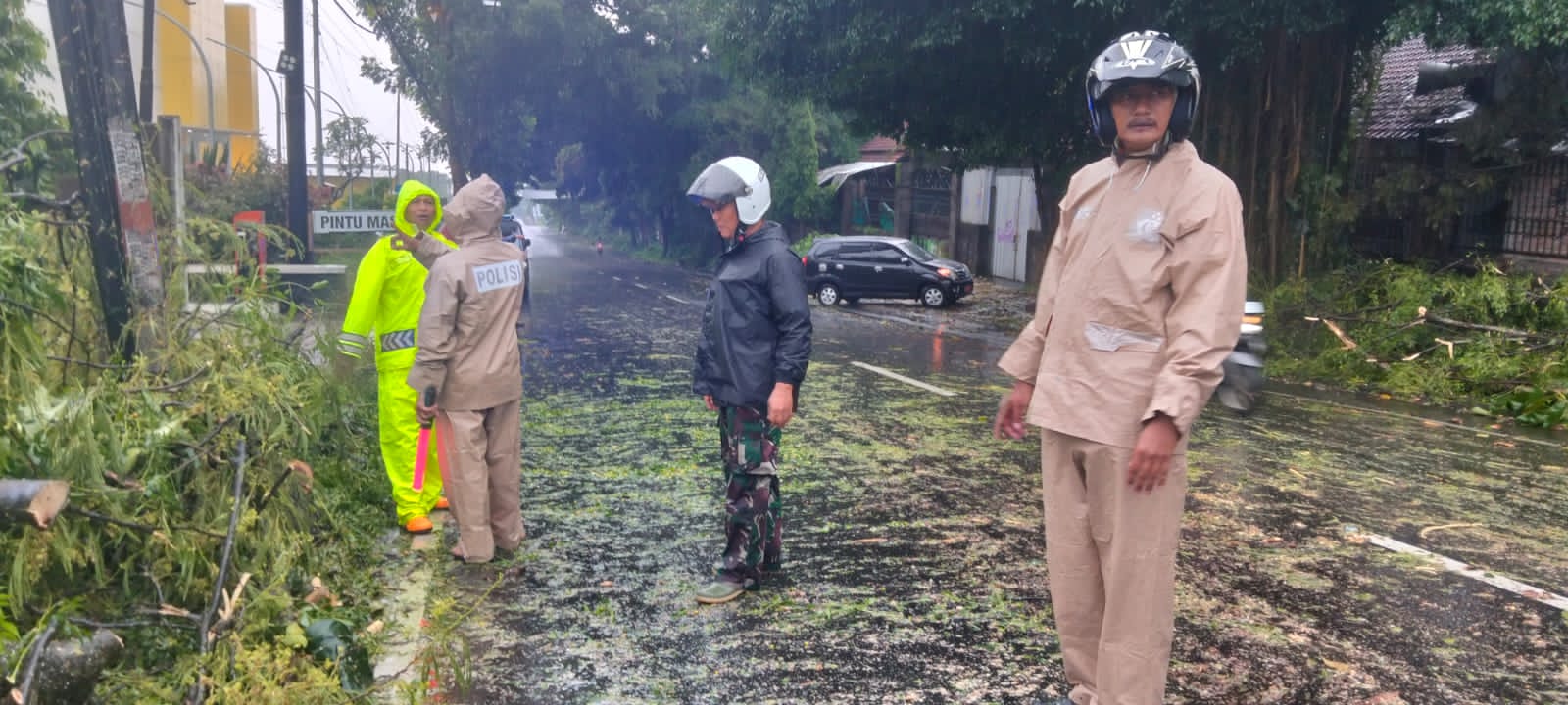 Boyolali, eNews - Aksi cepat dilakukan Babinsa Koramil 01/Kota Boyolali Kodim 0724/Boyolali Serma Oko Sutejo bersama Bhabinkamtibmas, personel BPBD, dan warga masyarakat saat sebuah pohon sengon berdiameter sekitar 80 cm tumbang dan menutup akses jalan Boyolali–Jatinom, tepatnya di Dukuh Tegalrejo, Desa Winong, Kecamatan Kota Boyolali, Jumat (5/12).