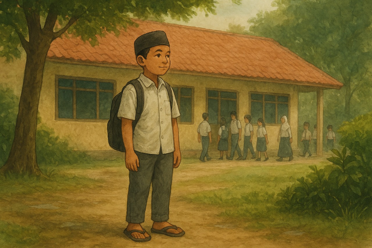 Pagi itu udara masih lembab setelah hujan semalam. Halaman sekolah tampak berkilau oleh sisa embun. Di antara riuh murid yang berlarian menuju kelas, berdirilah seorang anak dengan kemeja putih yang sudah agak kusam, celana abu-abu sedikit pudar, dan sandal jepit yang terlihat tak sepadan dengan seragamnya. Namanya Jono.
