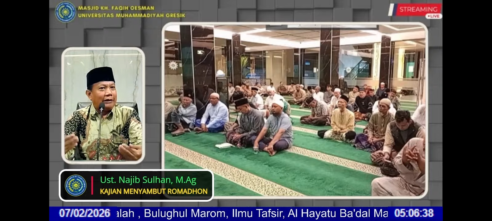 Gresik, eNews – Menjelang datangnya bulan suci Ramadhan yang penuh berkah, Masjid Faqih Oesman Universitas Muhammadiyah Gresik (UMG) menggelar Kajian Subuh spesial bertajuk "Strategi Menjadi Juara di Bulan Mulia". Acara yang berlangsung pada Sabtu (07/02/2026) ini menghadirkan Najib Sulhan, Ketua PCM Mulyorejo Surabaya, sebagai narasumber utama.