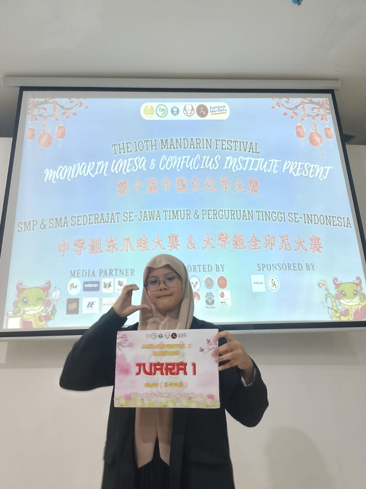 Sidoarjo, eNews - Sara Khalila Gumilar adalah santri putri kelas 8 Tahfizh yang berasal dari SMP DAFI Sidoarjo telah mengukir prestasi yang membanggakan. Ia sukses meraih juara pertama lomba pidato Bahasa Mandarin jenjang SMP – SMA tingkat Provinsi Jawa Timur dalam ajang yang bernama THE 10TH MANDARIN FESTIVAL 2025 pada tanggal 02 November 2025 yang diselenggarakan oleh Mandarin UNESA dan Confucius Institute. "Luar biasa kaget, bangga dan juga senang", ungkapnya.