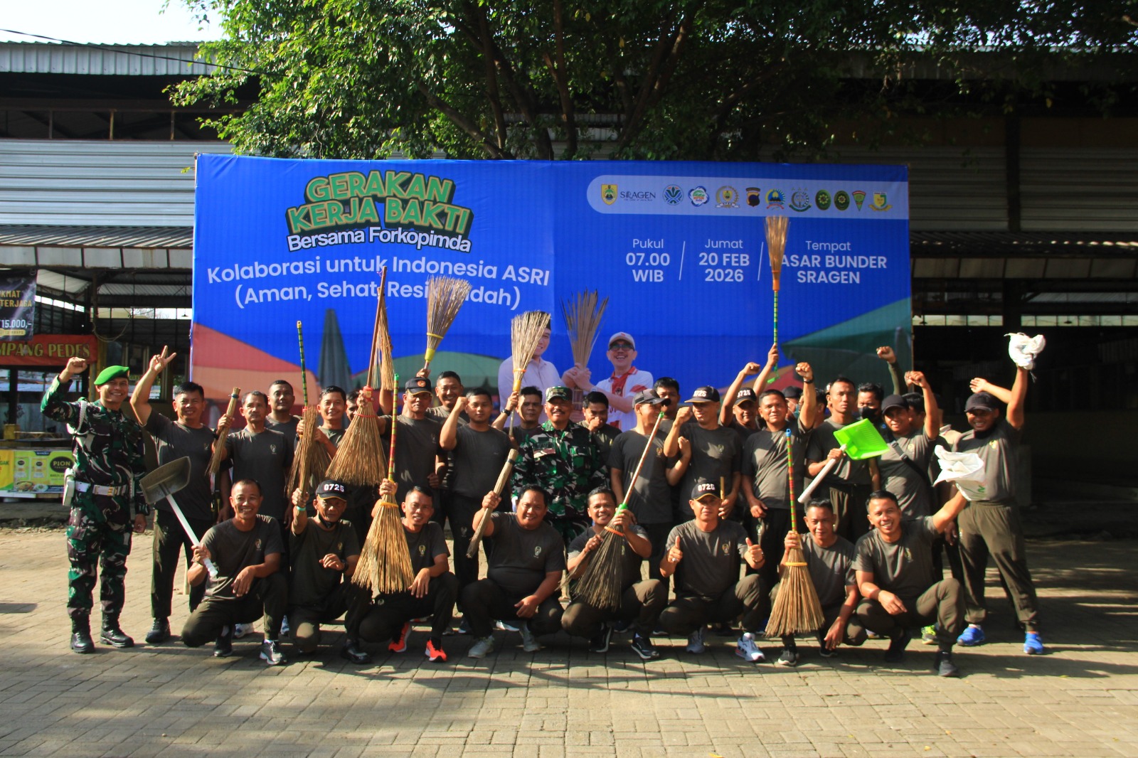 Sragen, eNews – Menindaklanjuti instruksi Presiden Republik Indonesia terkait pelestarian lingkungan, Kodim 0725/Sragen bersama Pemerintah Kabupaten Sragen dan Polres Sragen menggelar aksi kerja bakti kolaboratif di kawasan Pasar Bunder, Sragen, Jumat (20/02/2026).
