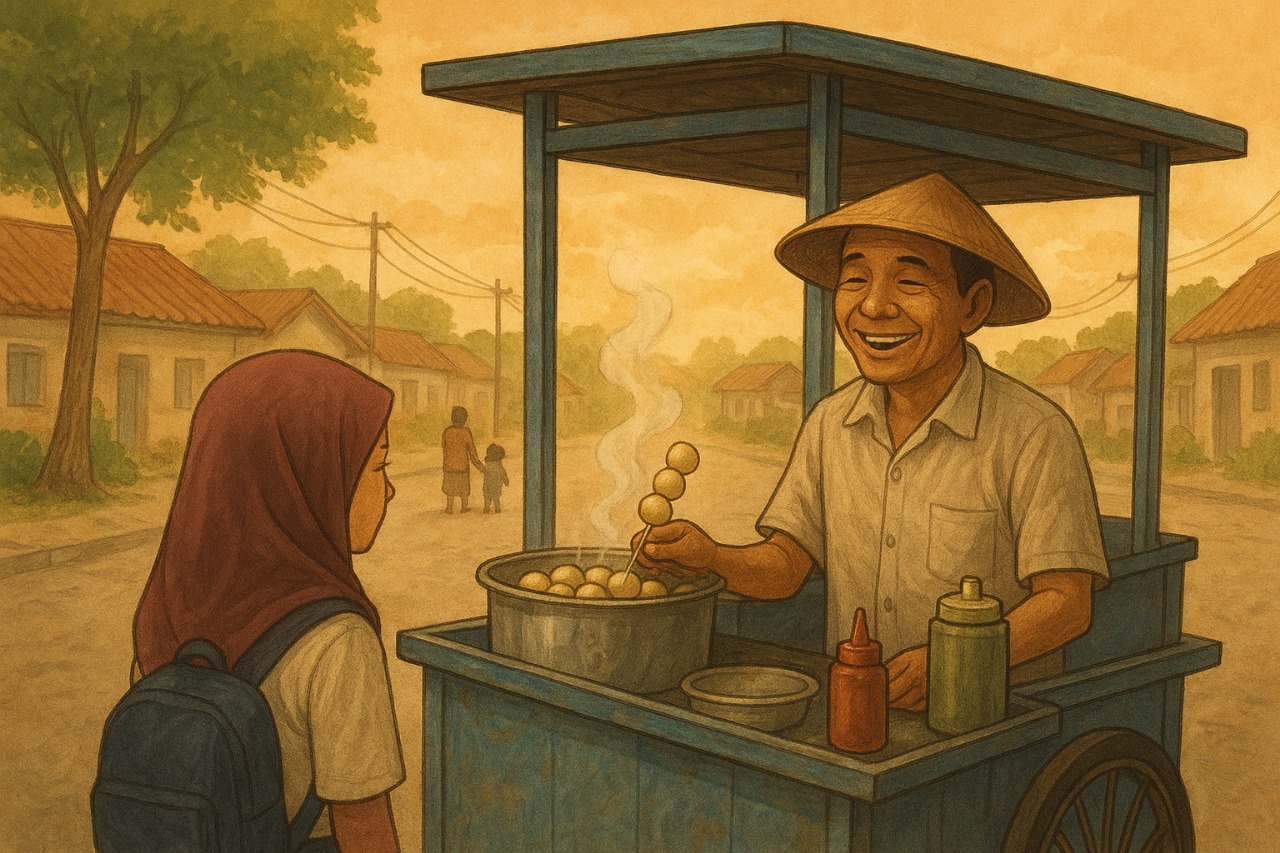 Tawanya sederhana, tapi tulus. Tawa yang membuat anak-anak merasa dekat, dan para orang tua percaya menitipkan uang jajan pada penjual sejujur dia. Di balik tawa itu, tersimpan perjuangan panjang—hari-hari di mana hujan deras mengguyur jalanan hingga gerobaknya basah kuyup, atau ketika panas terik membuat tubuhnya lemas, tetapi langkahnya tak pernah berhenti.